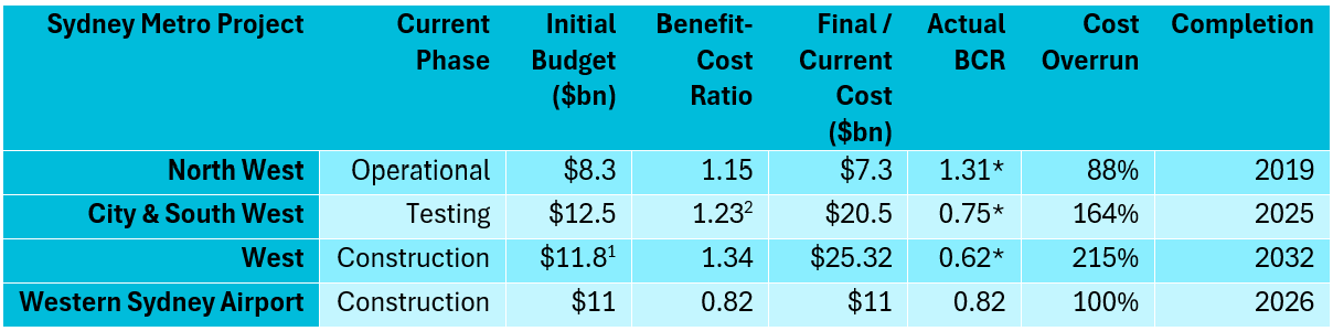1 – Sydney Metro West Initial budget not provided by NSW Government. Inferred from BCR and Net Present Value of Project Benefits